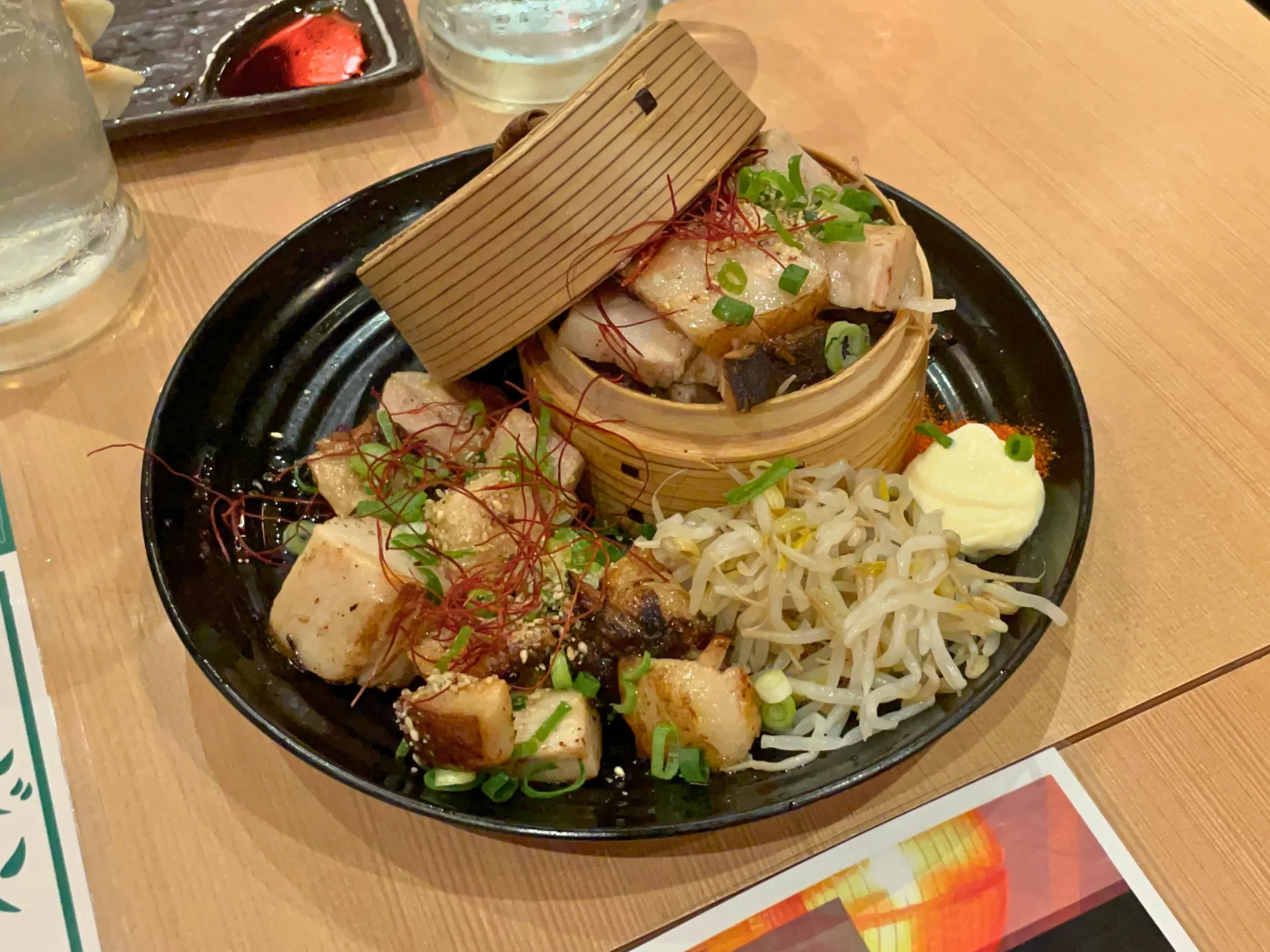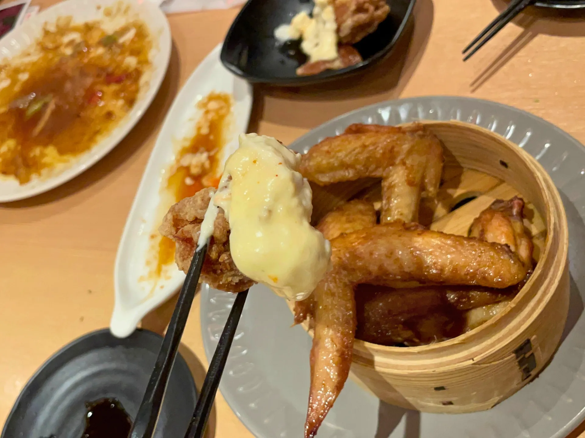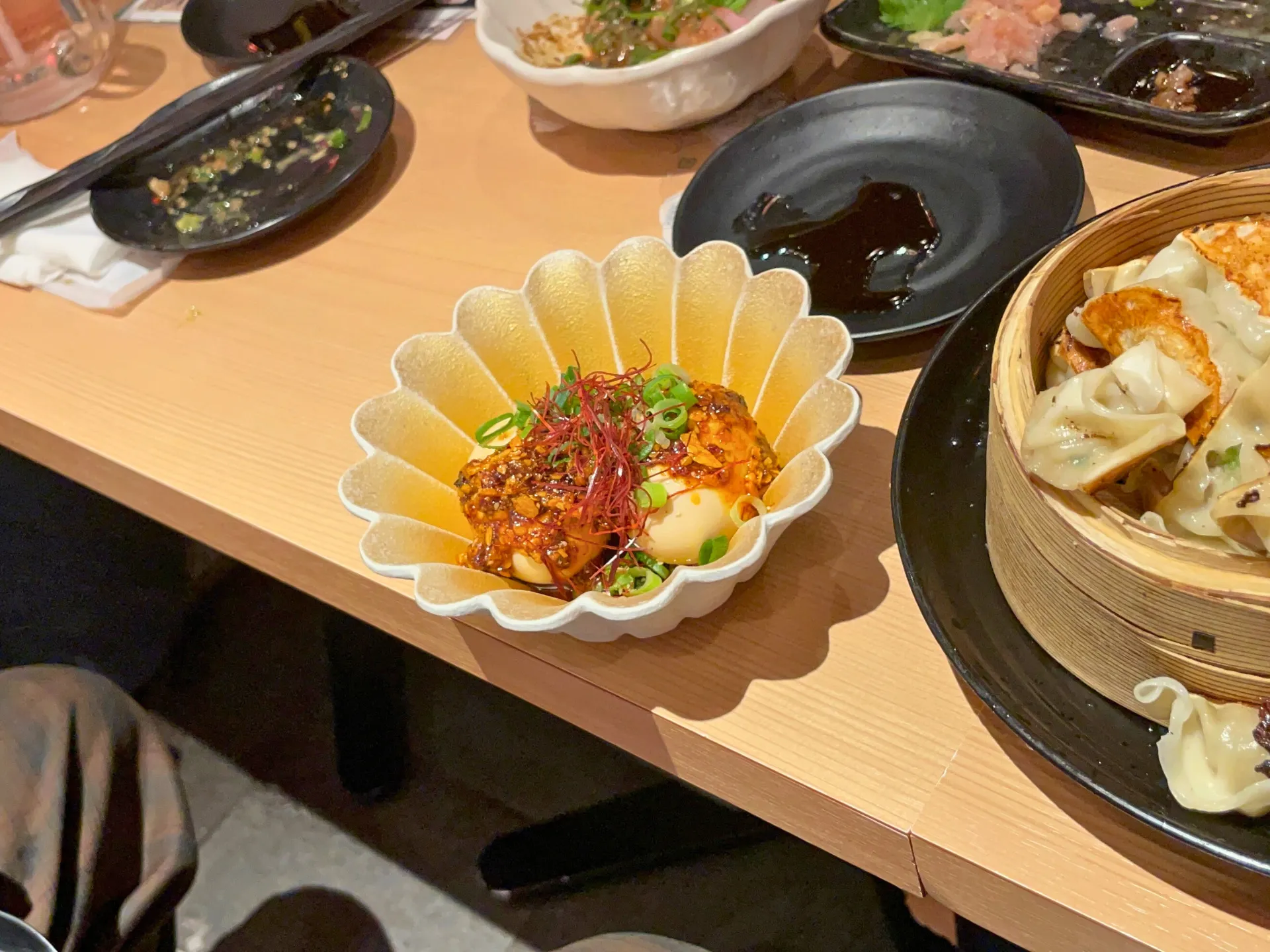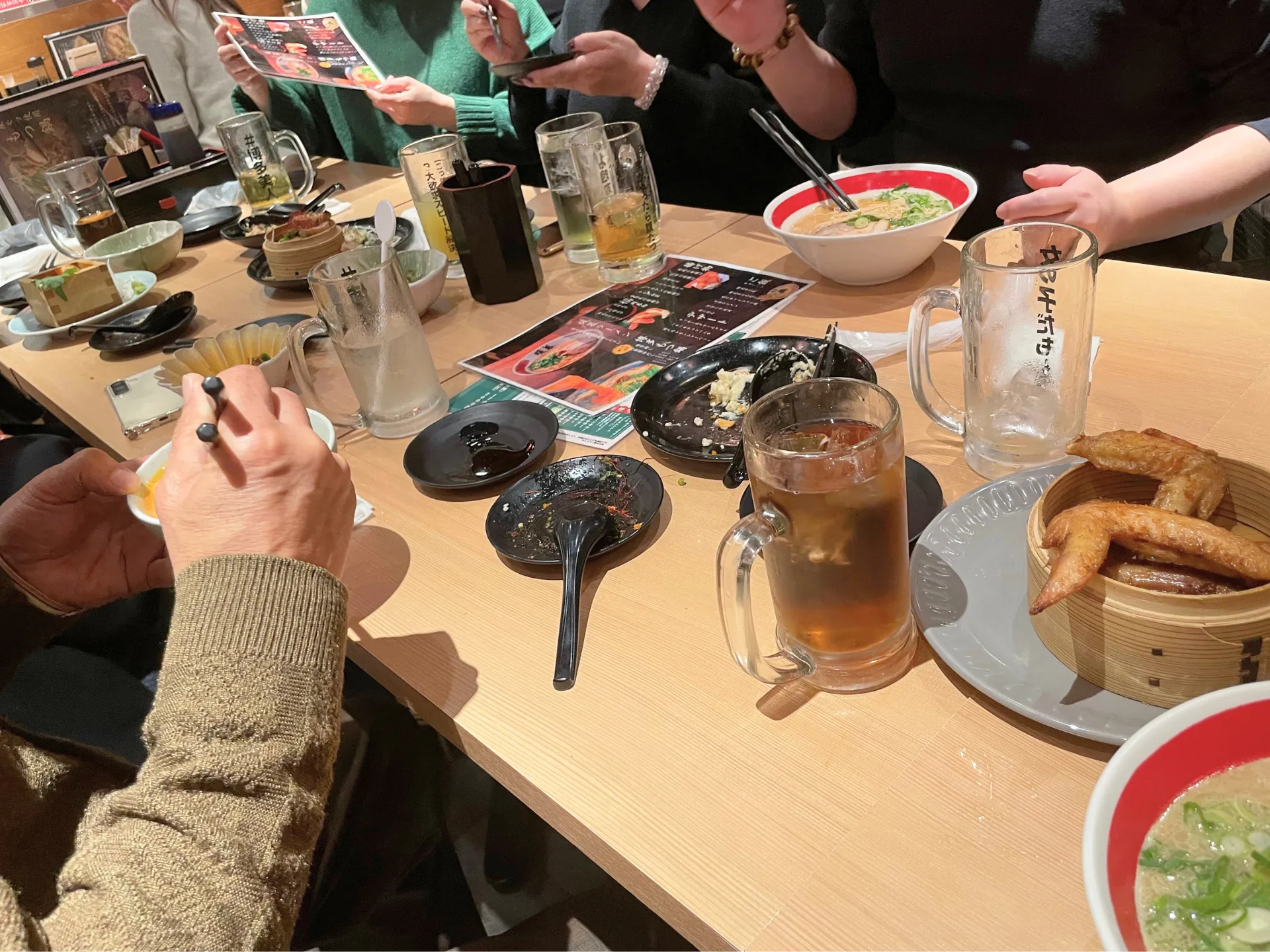 提灯の灯りが印象的な店内で、名物の「こぼれ餃子」がテーブルに運ばれると、その迫力に思わず笑顔がこぼれ、自然と会話が弾み始めました。