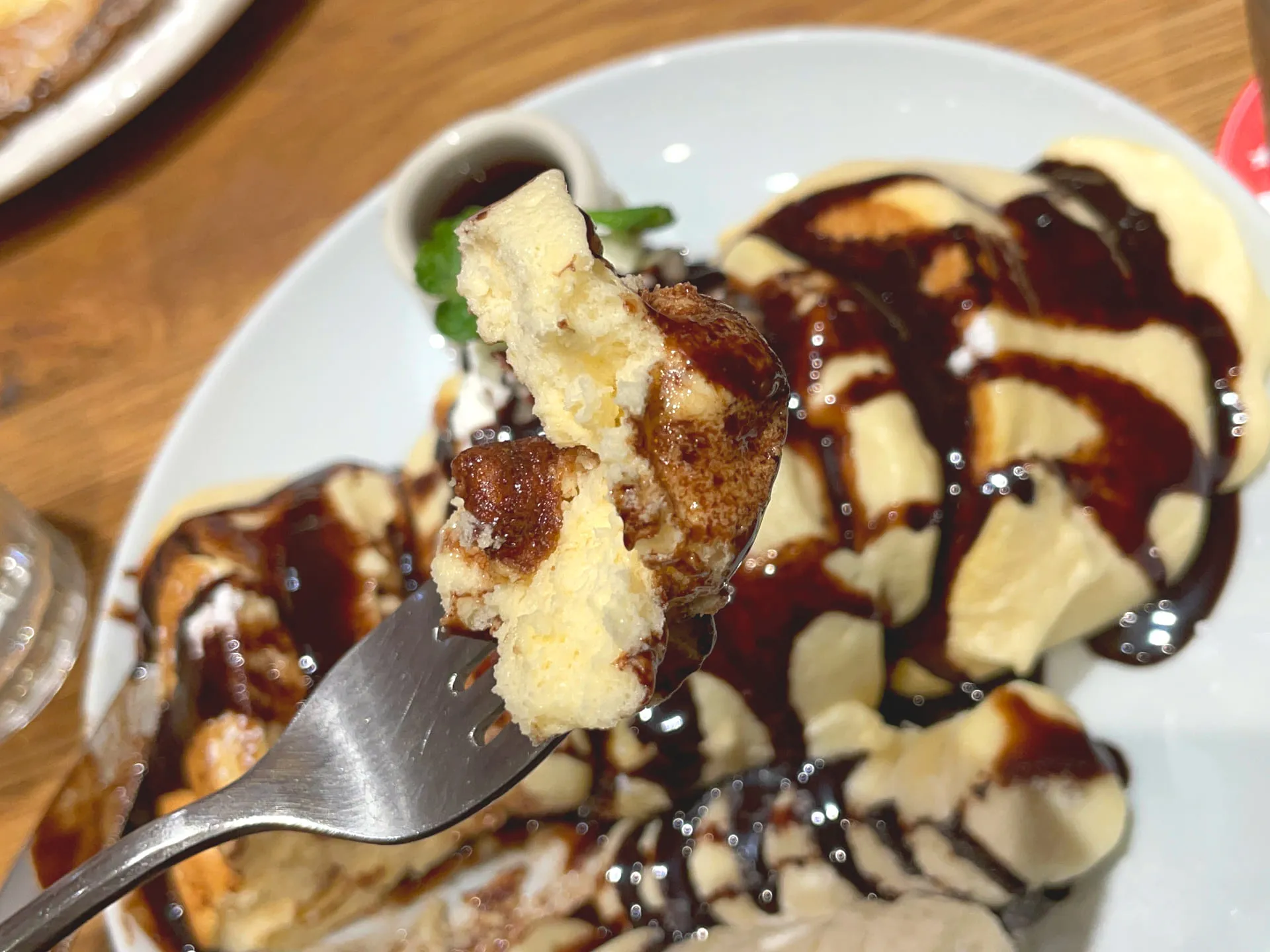 フワフワしっとりであっさりとした味わいのパンケーキと濃厚なチョコソースが合わさって美味しかったです♪