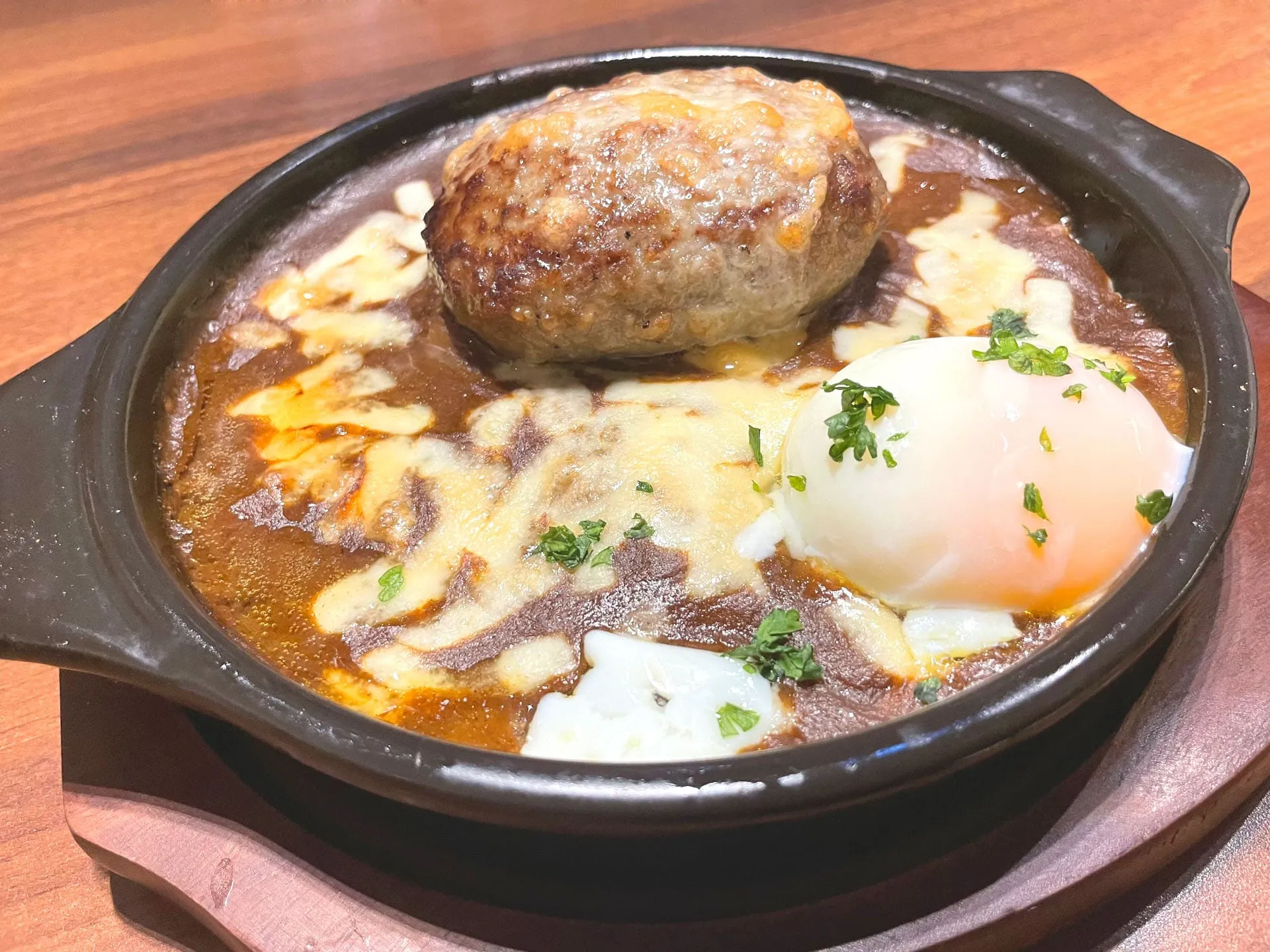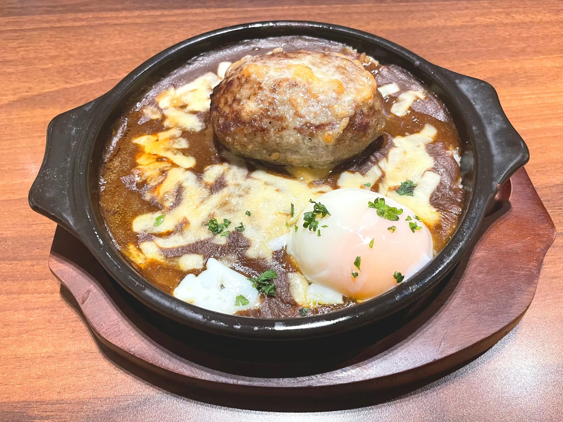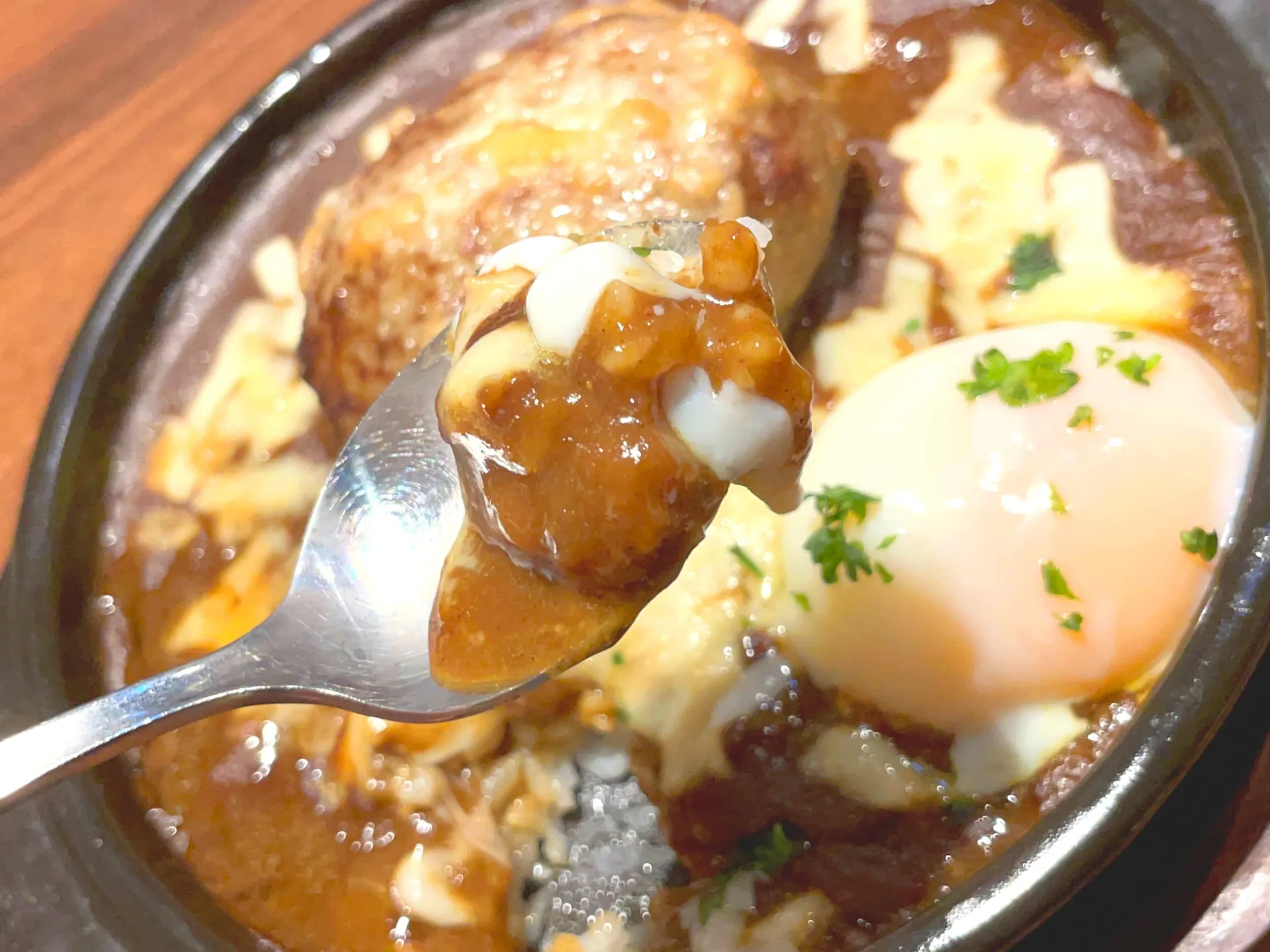 ハンバーグ焼きカレーを注文しましたが、熱々の鉄板で運ばれてきてハンバーグも肉厚で、卵と一緒にいただくと味わいもマイルドでとても美味しかったです^ ^