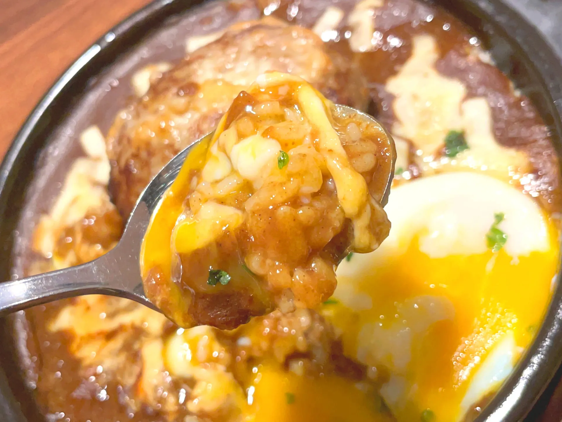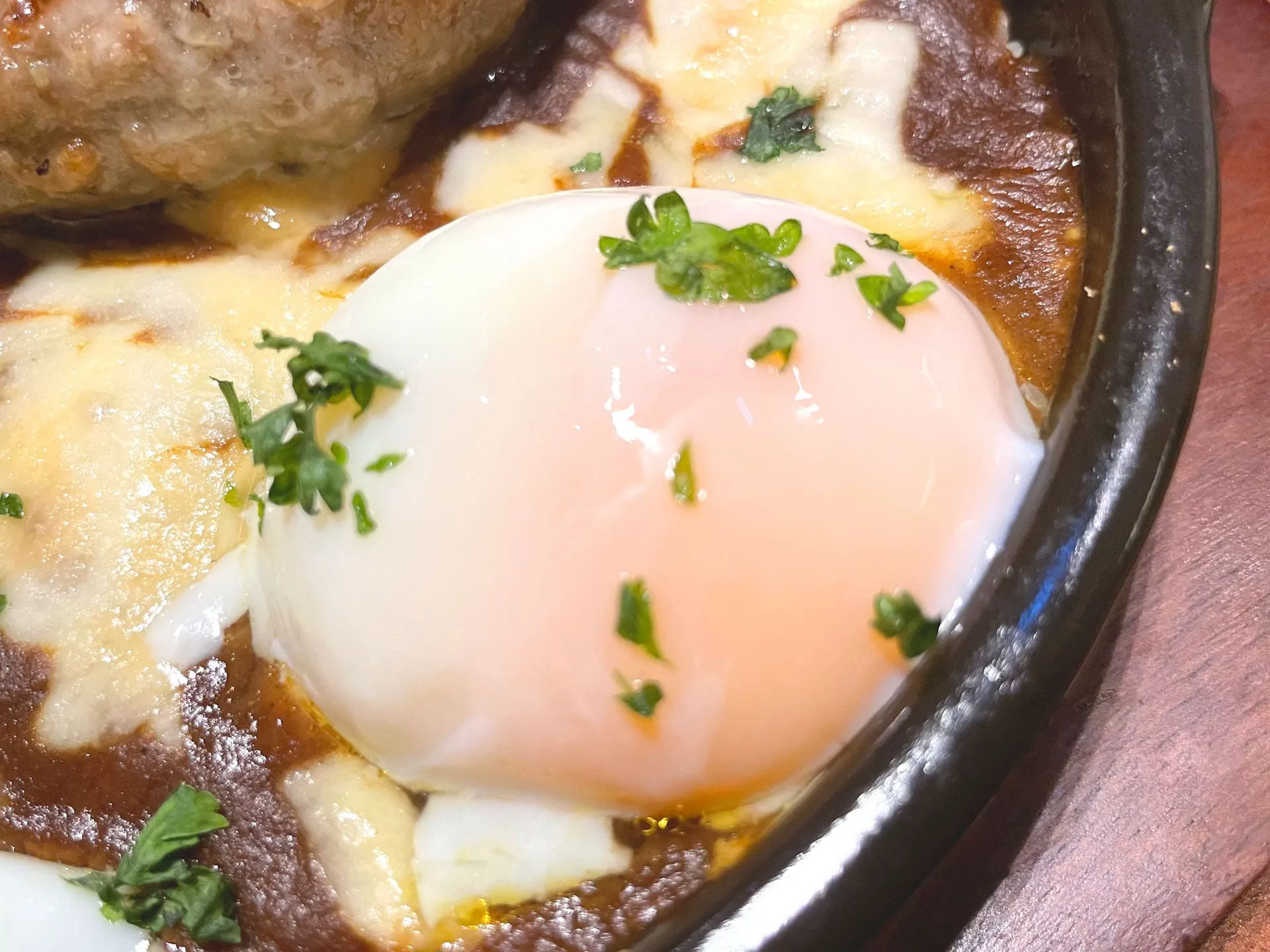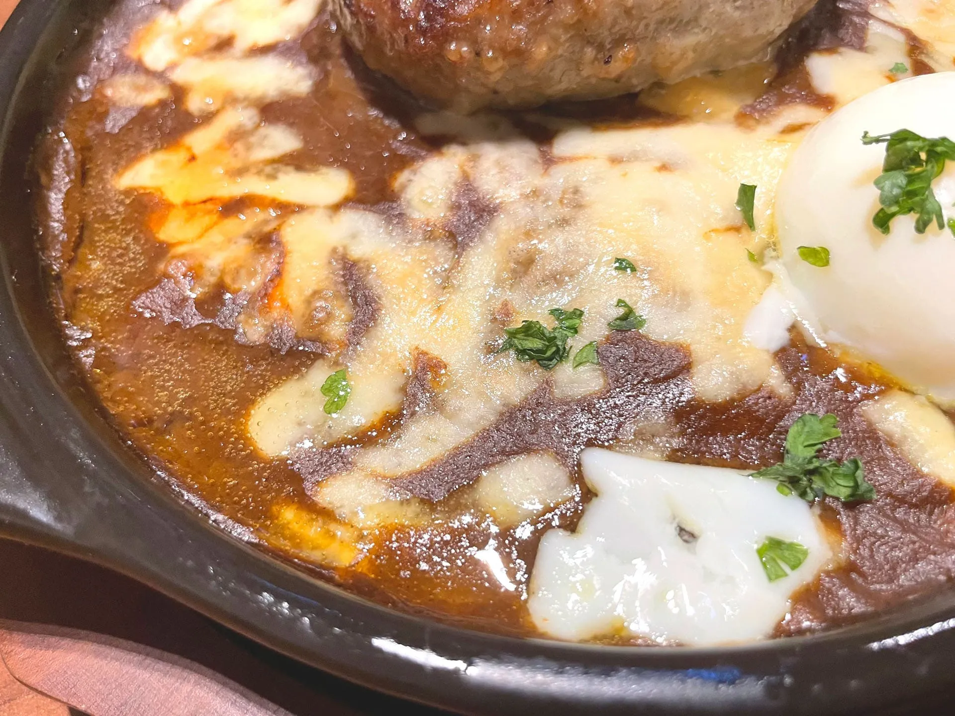 ハンバーグ焼きカレーを注文しましたが、熱々の鉄板で運ばれてきてハンバーグも肉厚で、卵と一緒にいただくと味わいもマイルドでとても美味しかったです^ ^