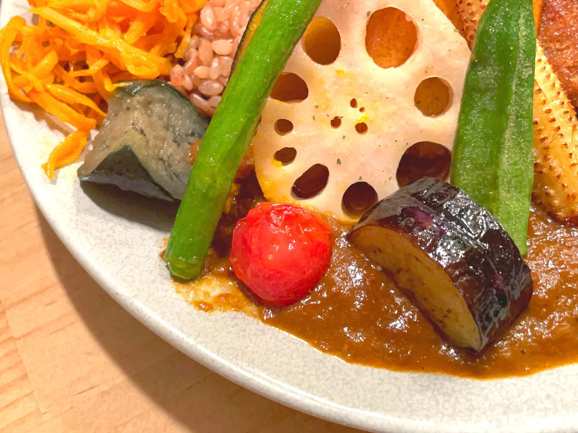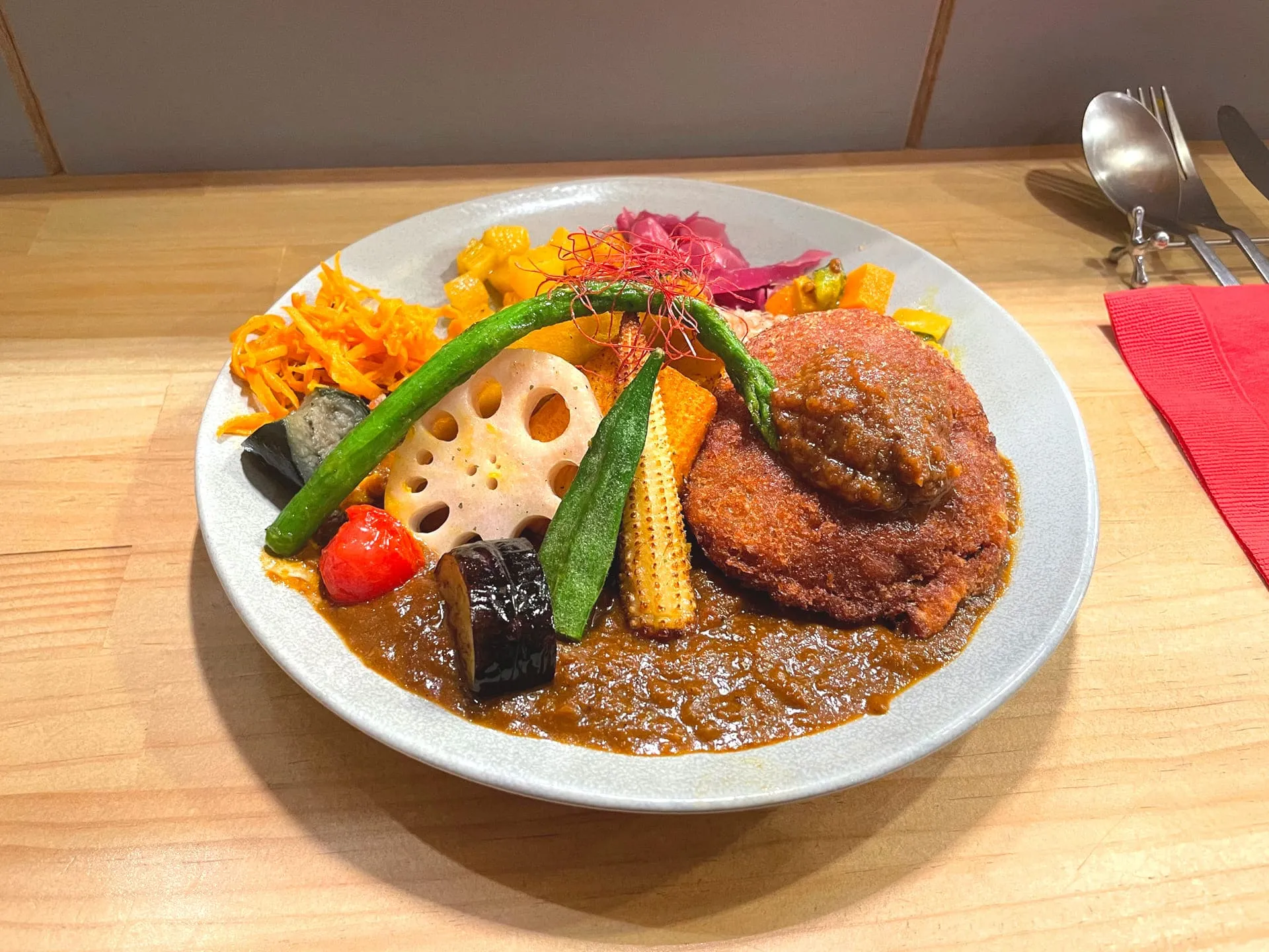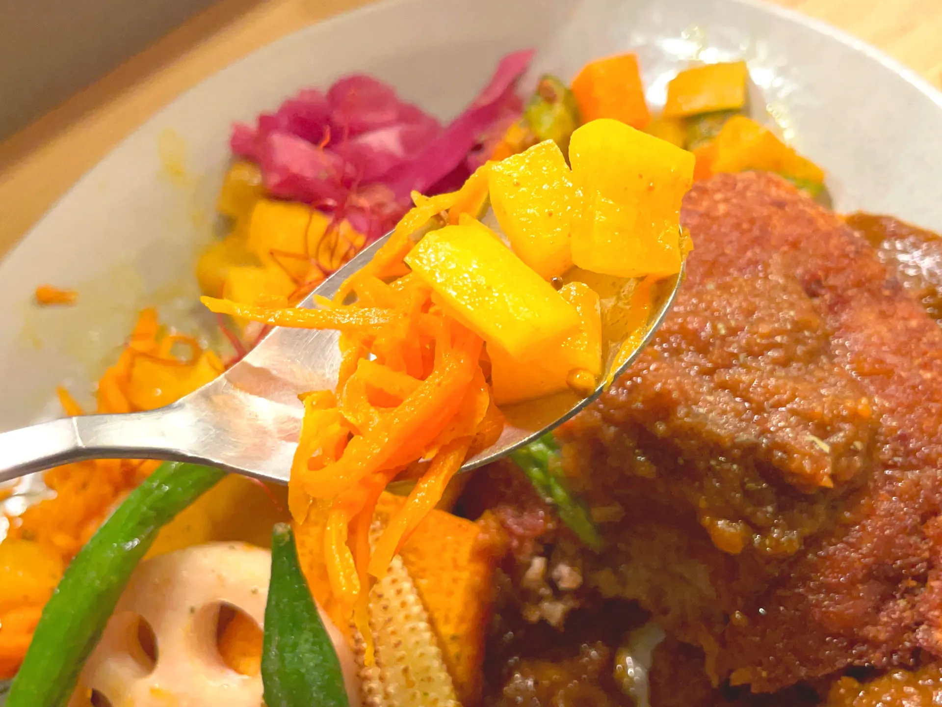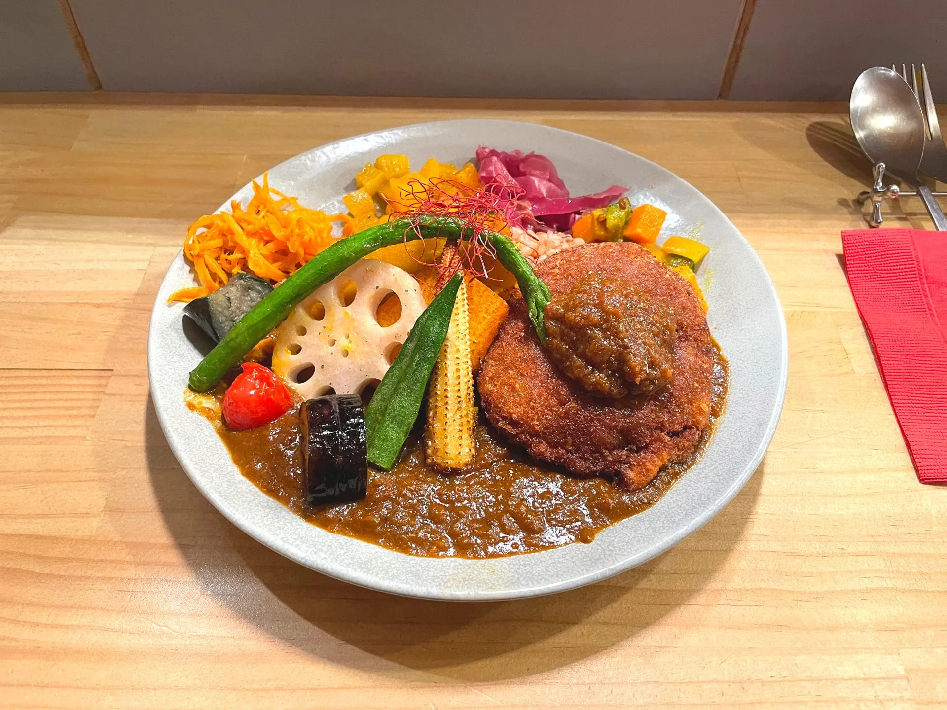 お店のカレーは特製のスパイスと出汁、野菜の旨味を生かした化学調味料を使わないヘルシーなメニューだそうで、色鮮やかで心地よい辛さのカレーを楽しめます^ ^