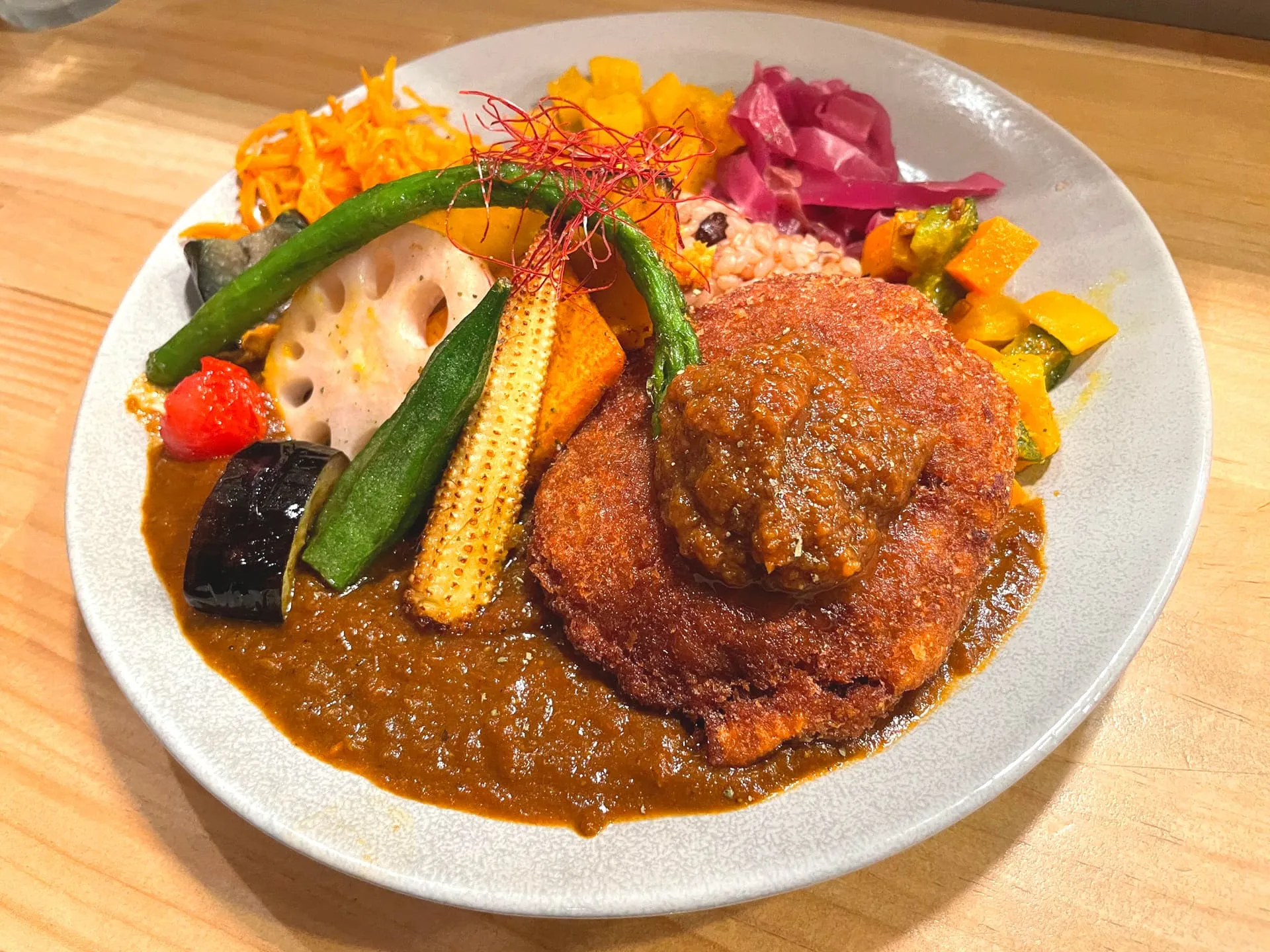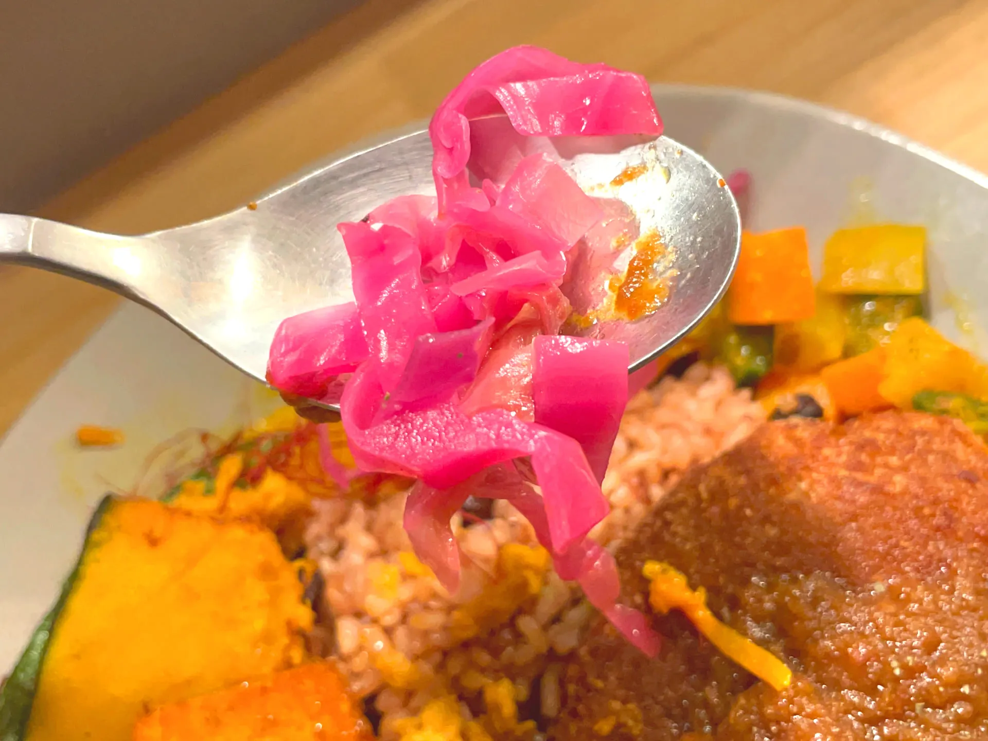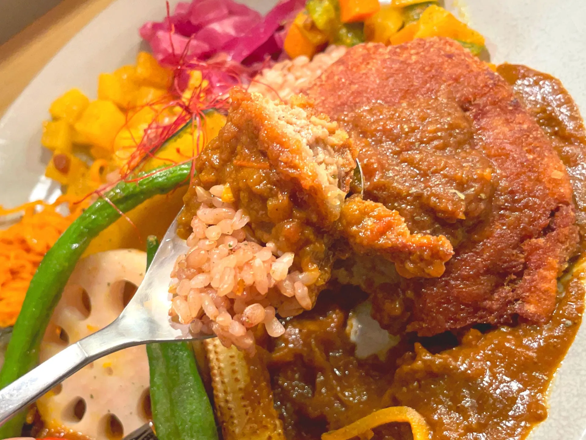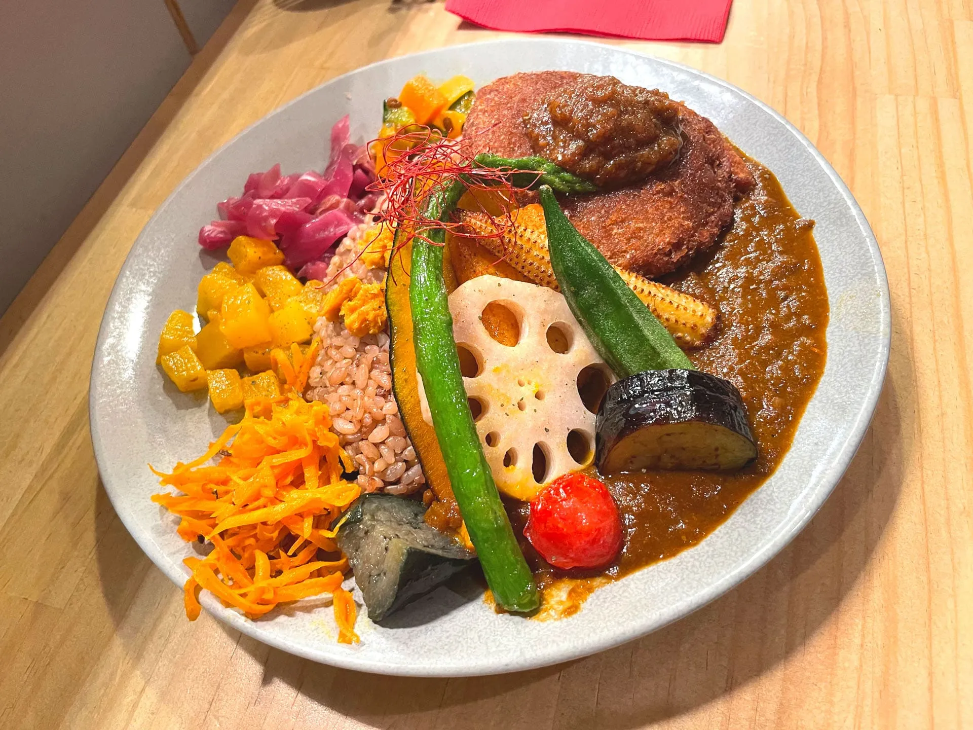 お店のカレーは特製のスパイスと出汁、野菜の旨味を生かした化学調味料を使わないヘルシーなメニューだそうで、色鮮やかで心地よい辛さのカレーを楽しめます^ ^