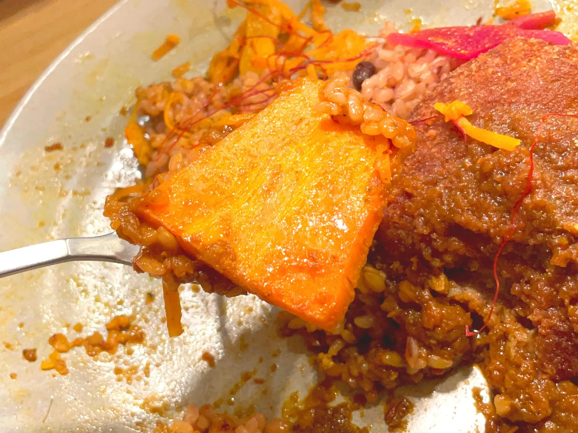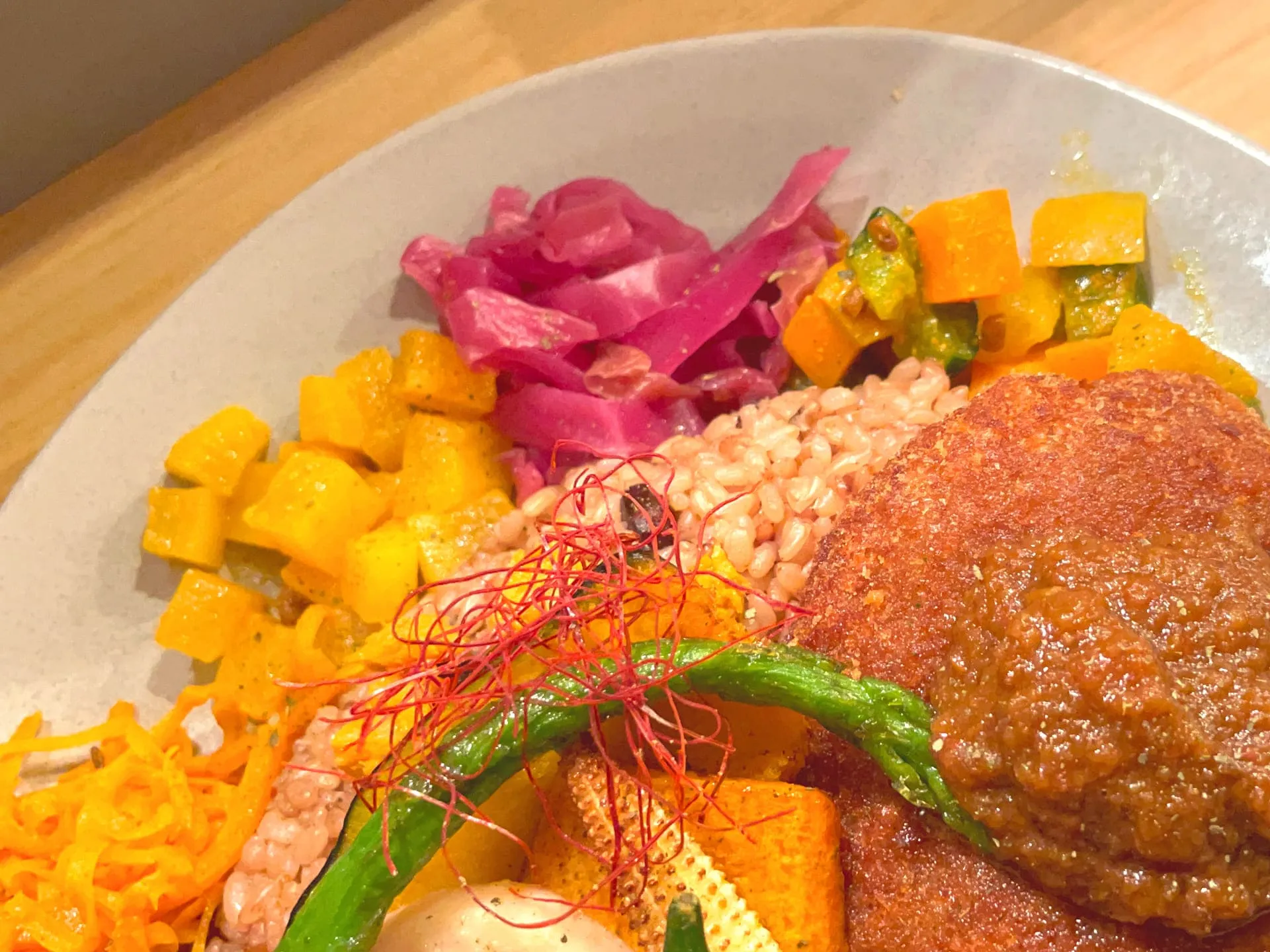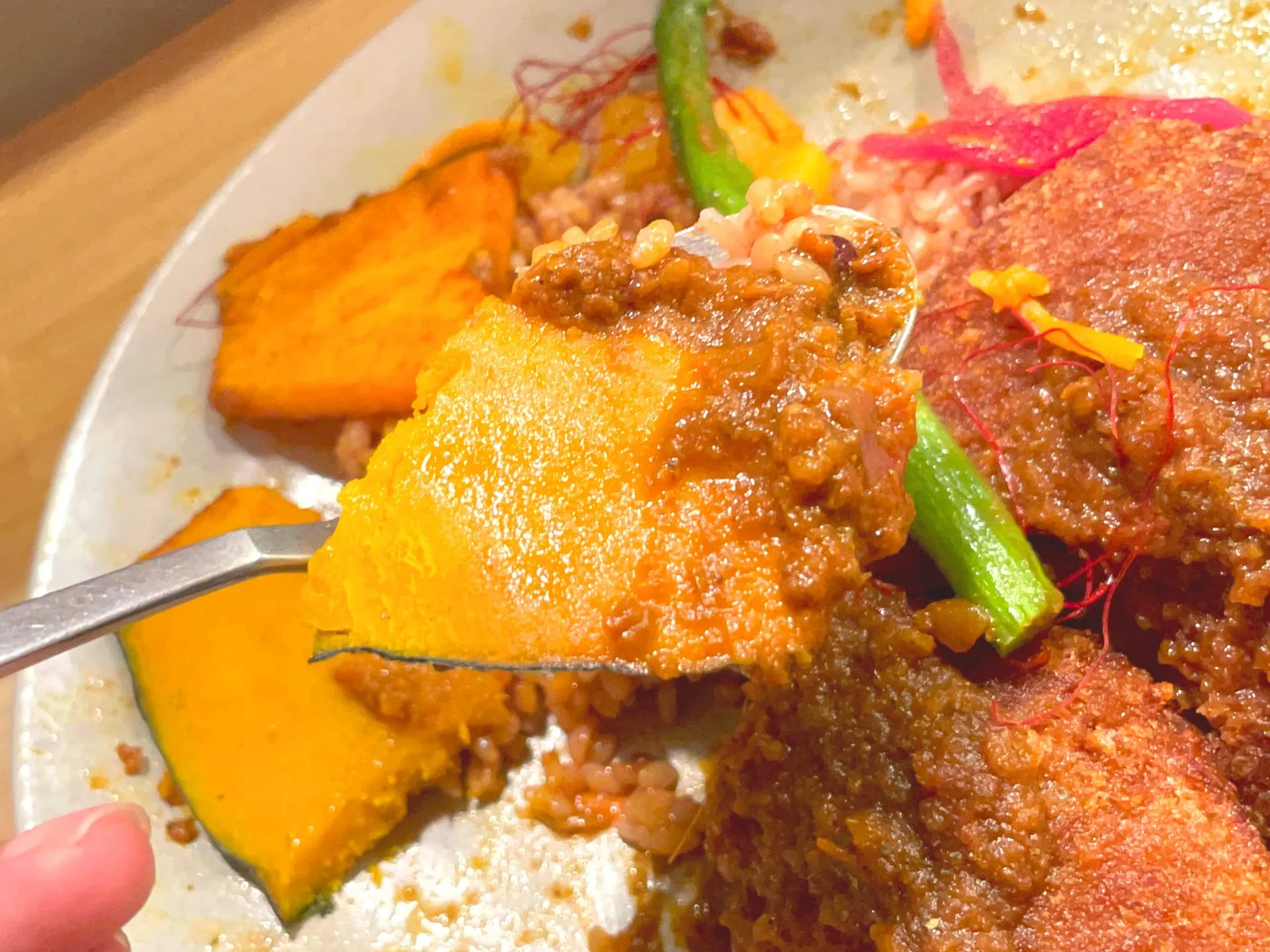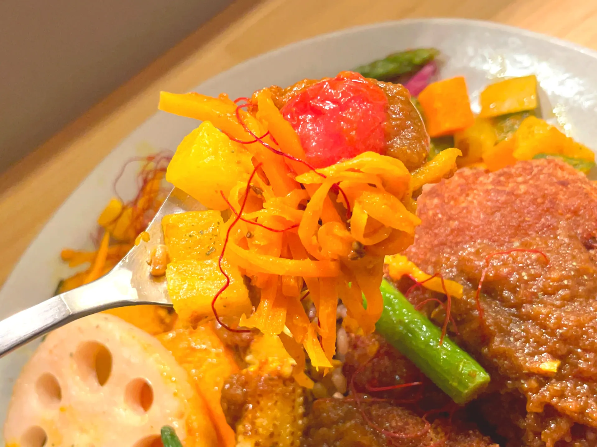 お店のカレーは特製のスパイスと出汁、野菜の旨味を生かした化学調味料を使わないヘルシーなメニューだそうで、色鮮やかで心地よい辛さのカレーを楽しめます^ ^