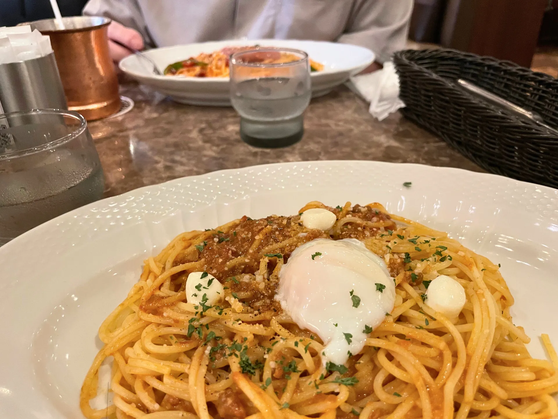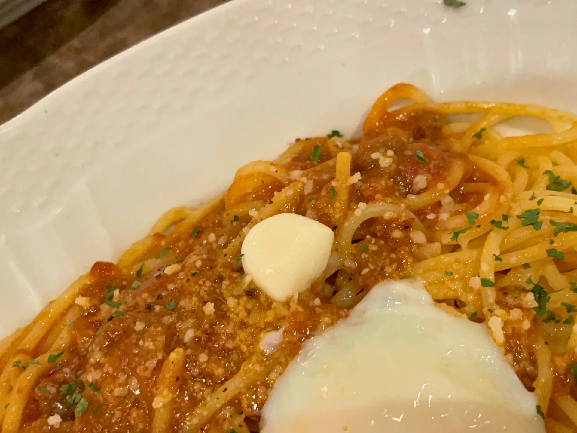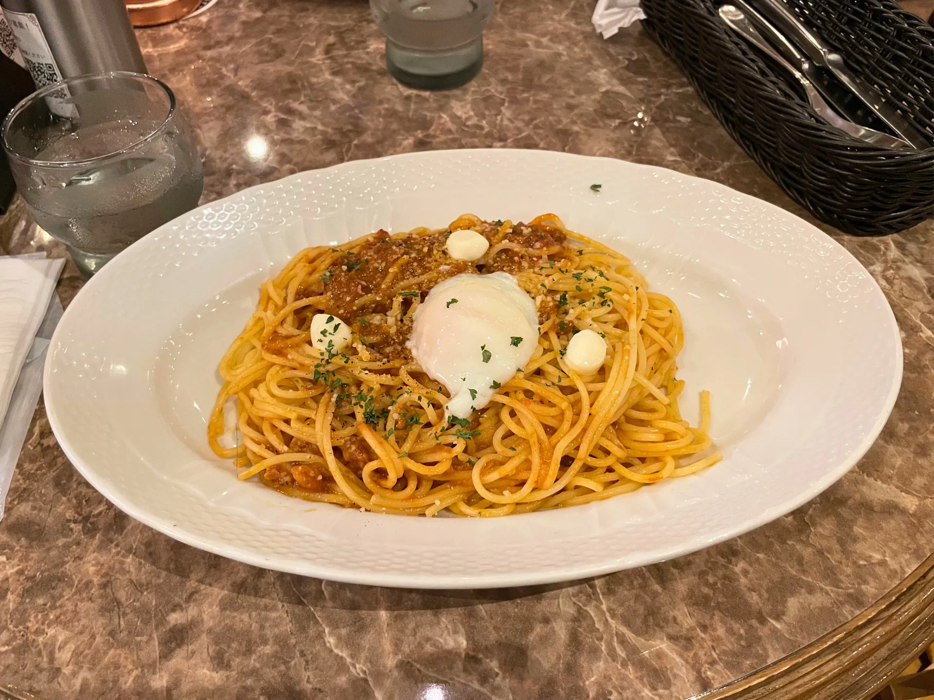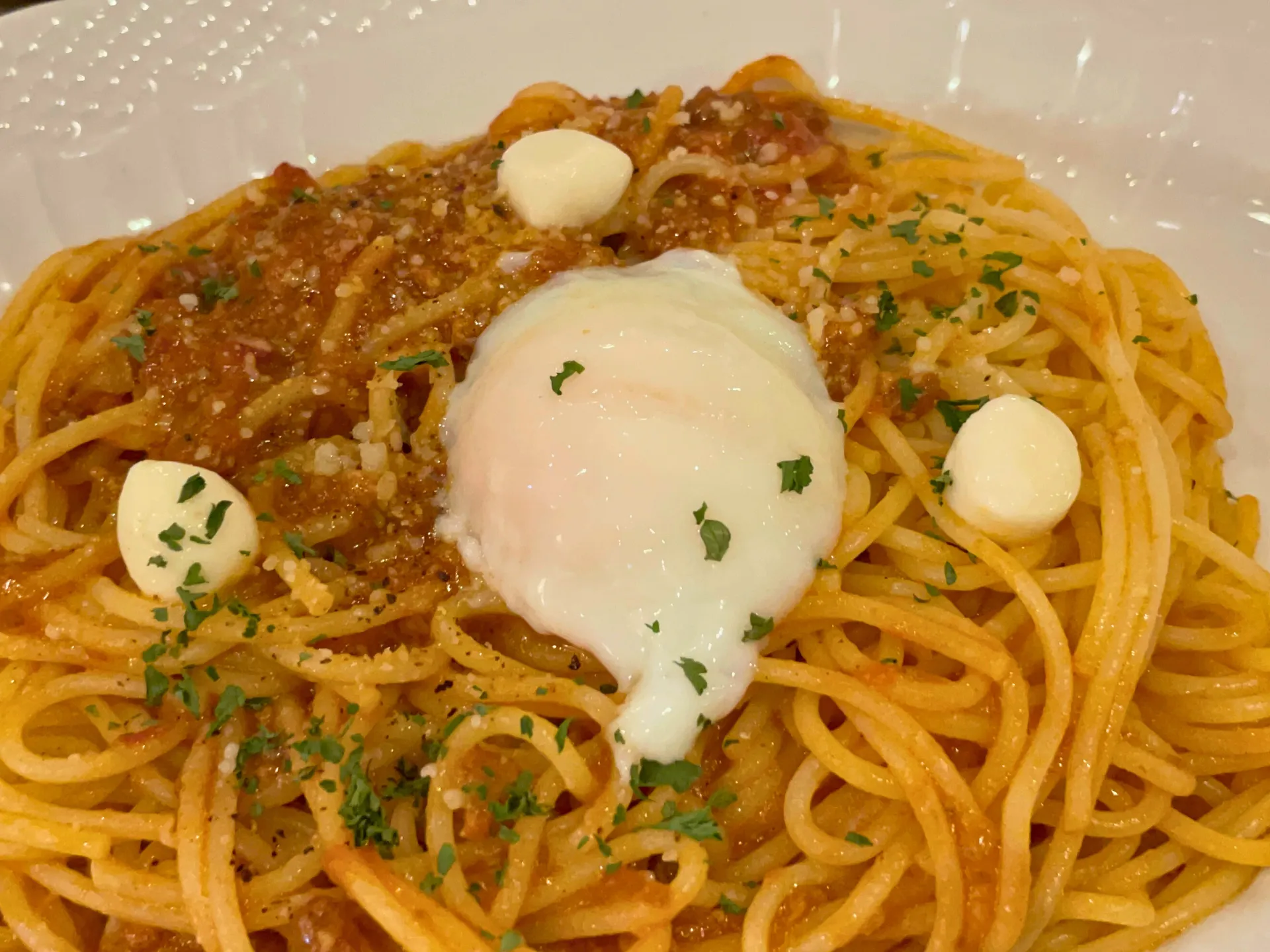ひき肉たっぷりのミートソースと半熟卵が絶妙に絡み合い、口の中に幸せが広がる一品です。