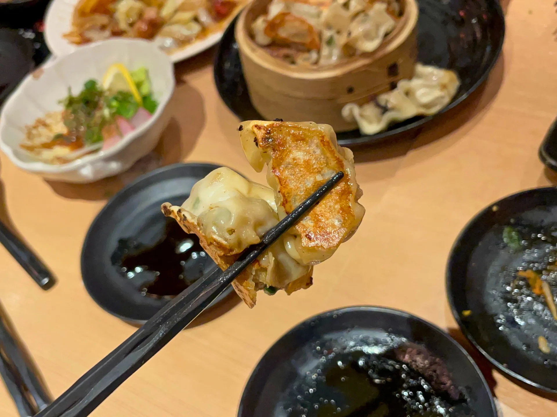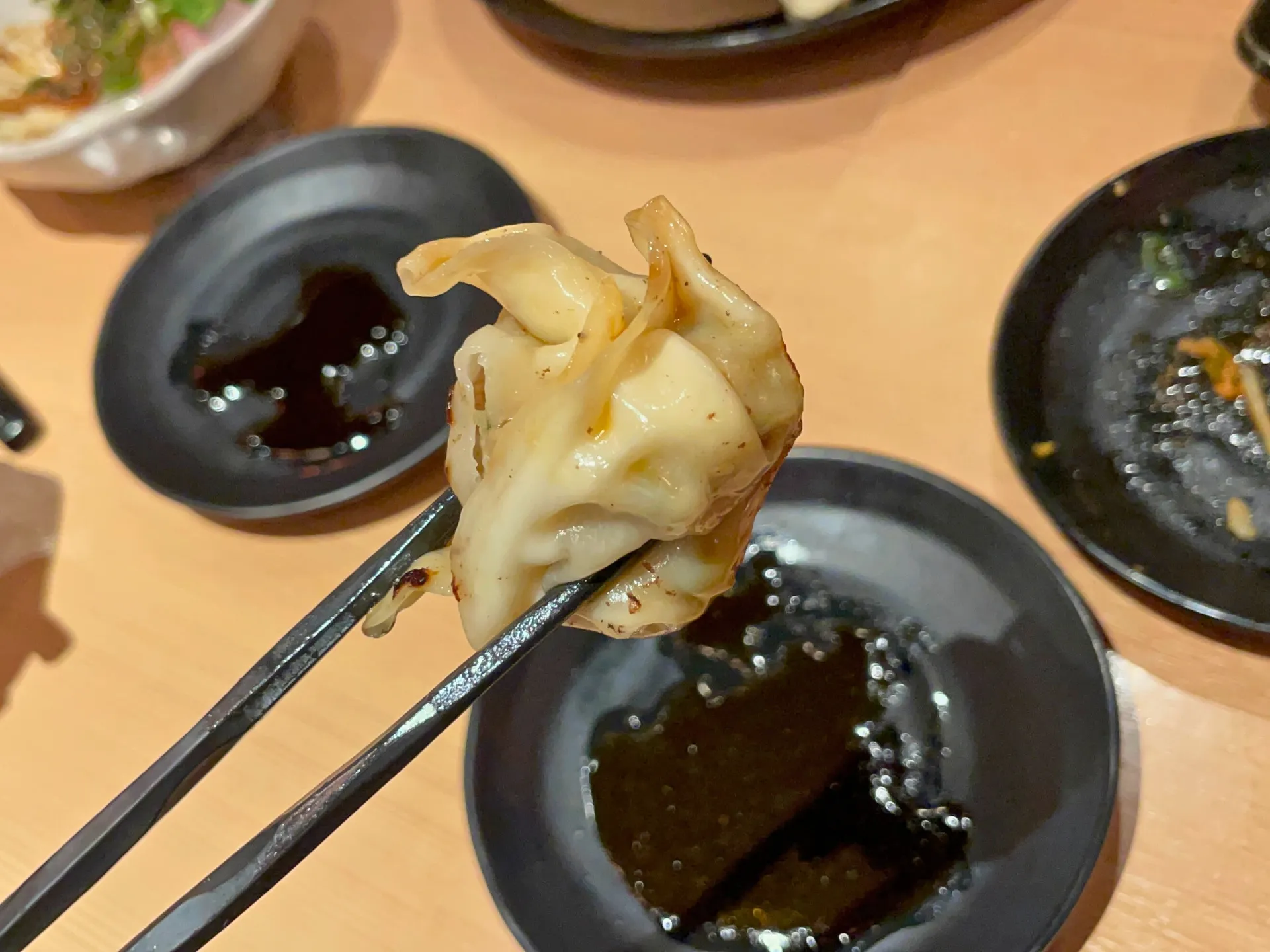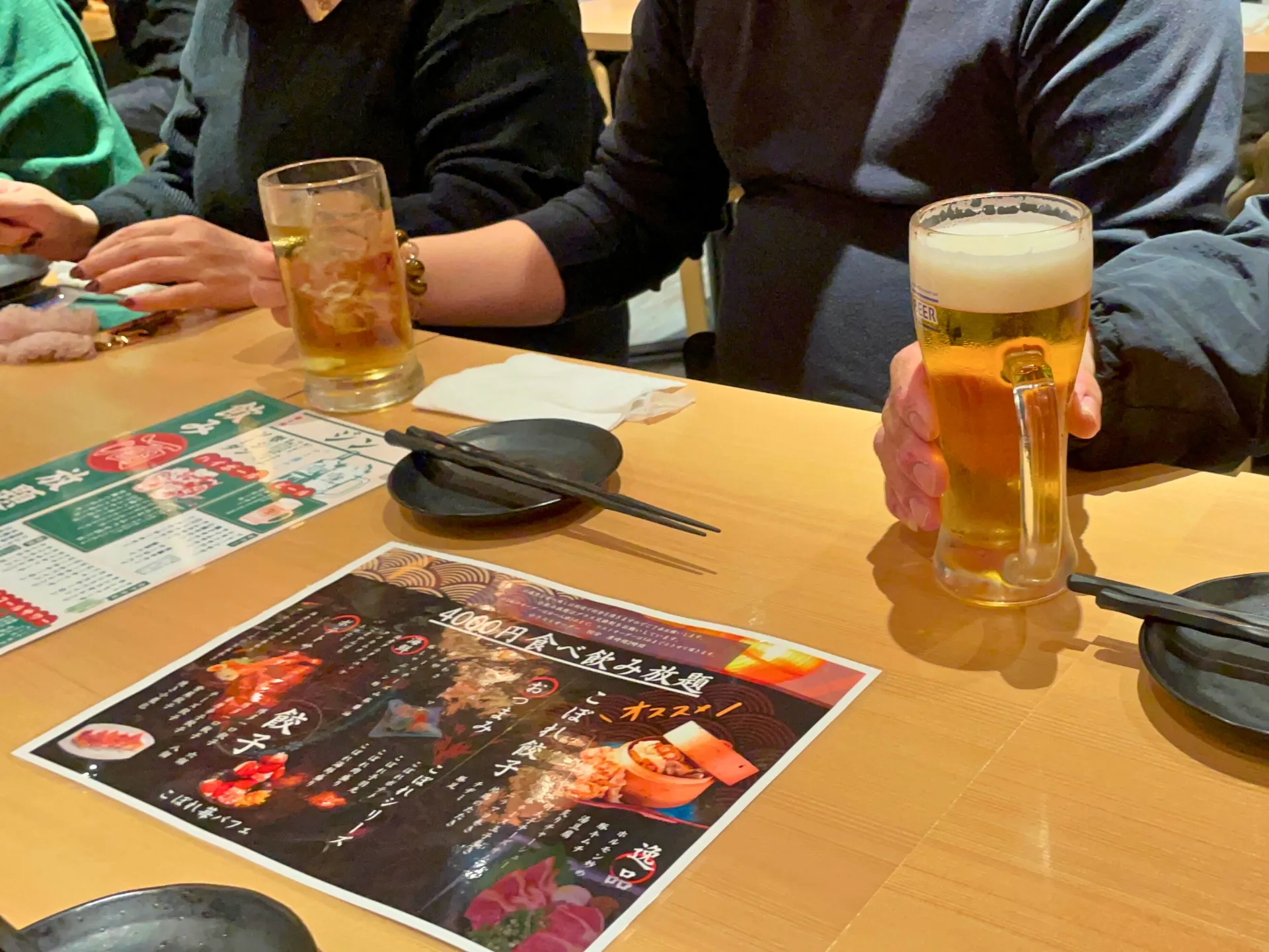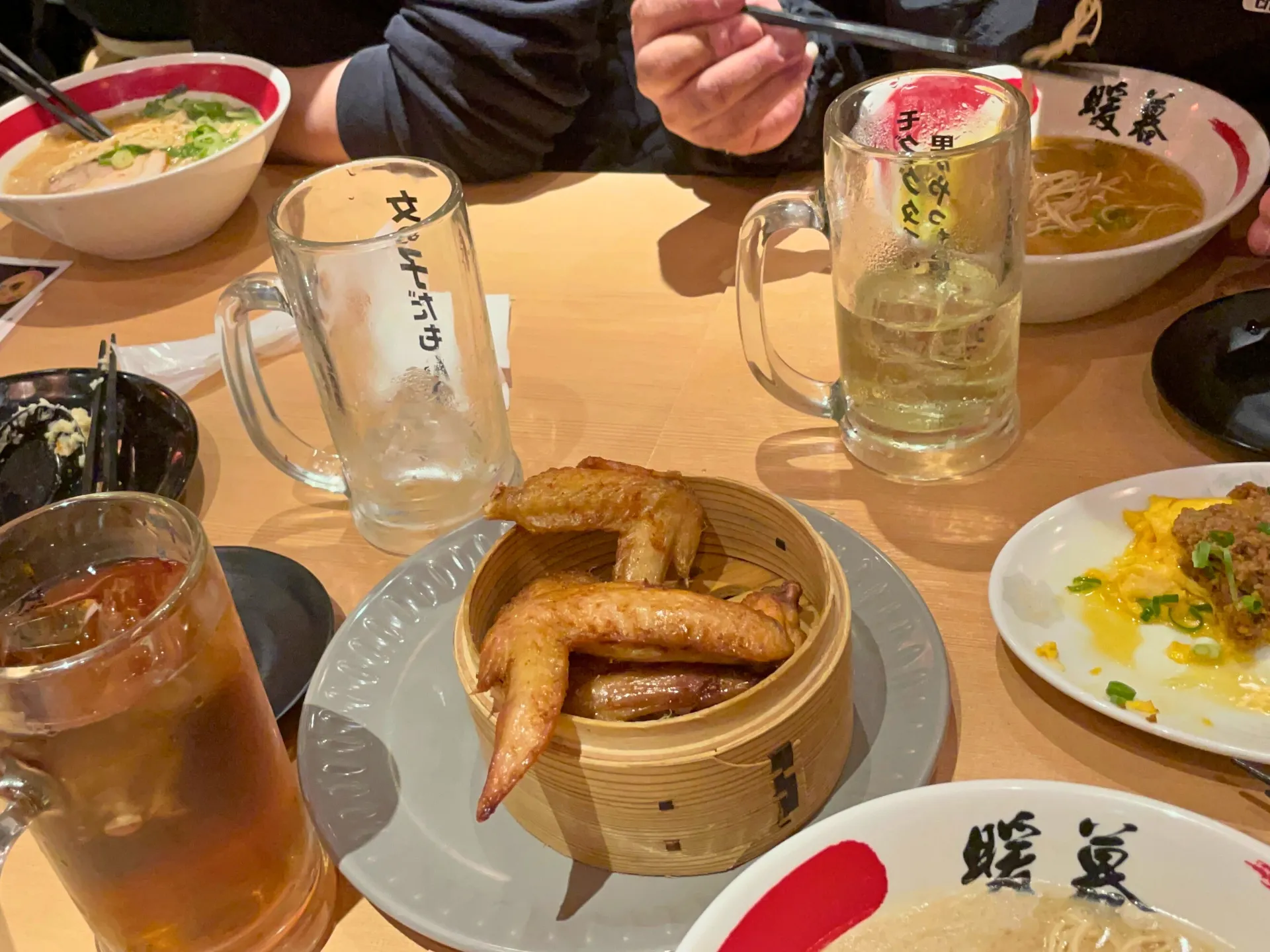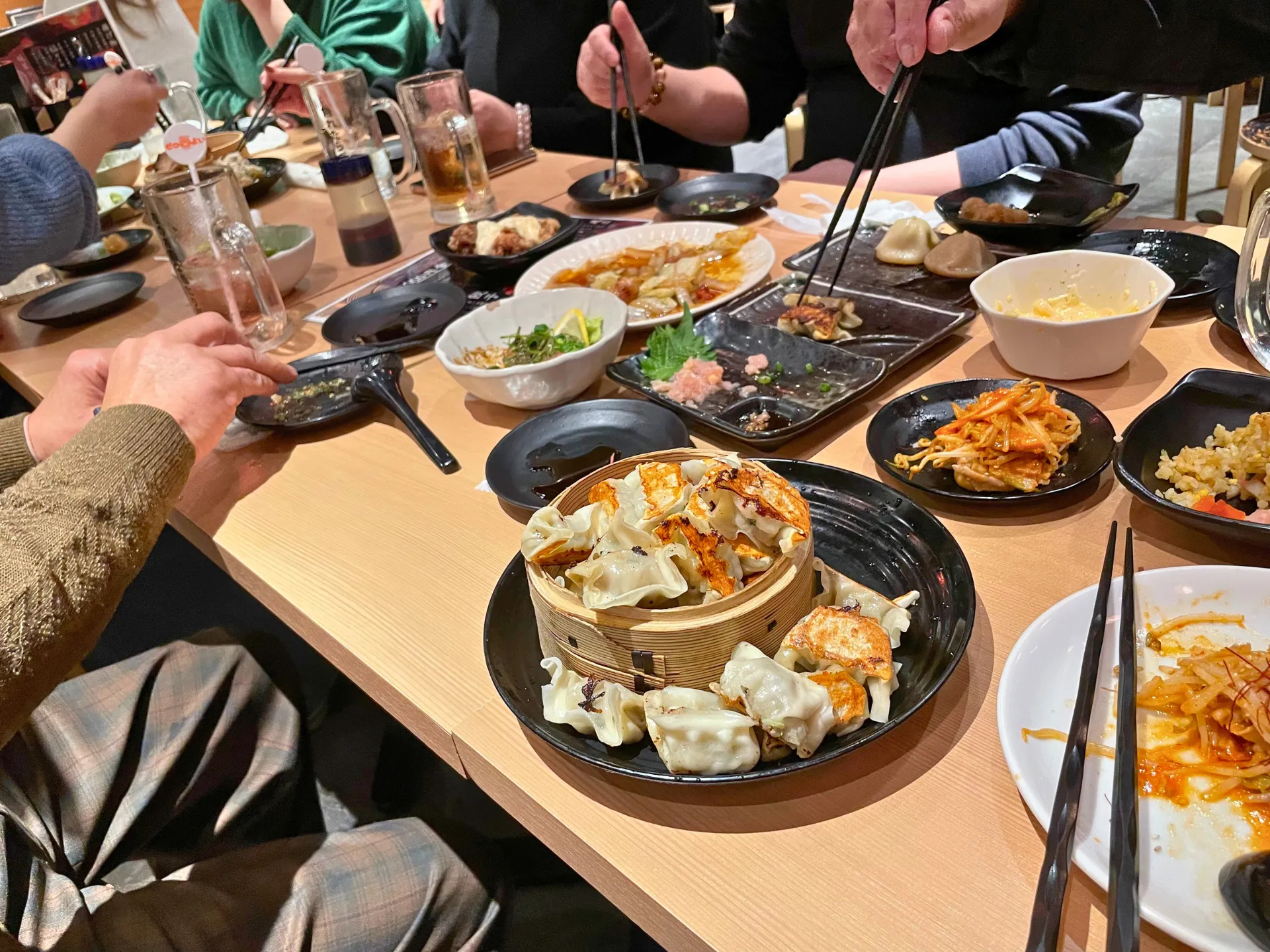 提灯の灯りが印象的な店内で、名物の「こぼれ餃子」がテーブルに運ばれると、その迫力に思わず笑顔がこぼれ、自然と会話が弾み始めました。