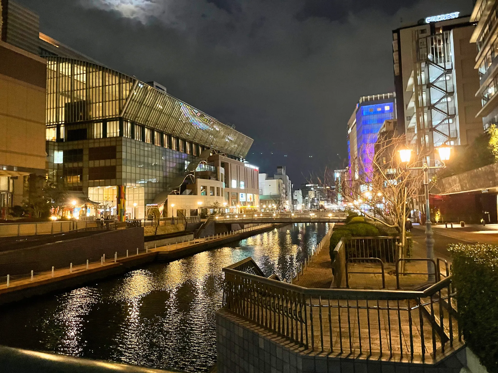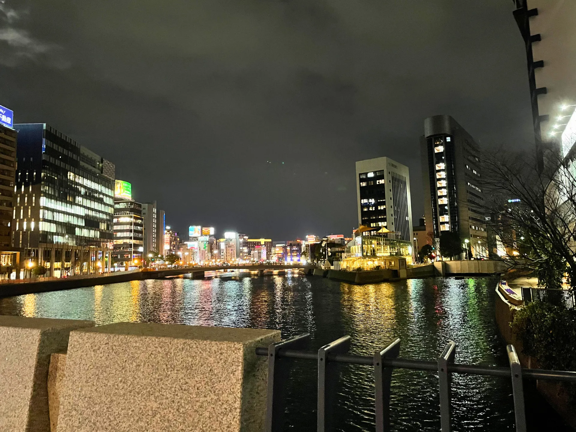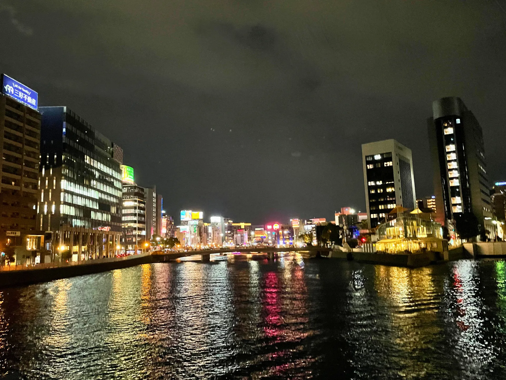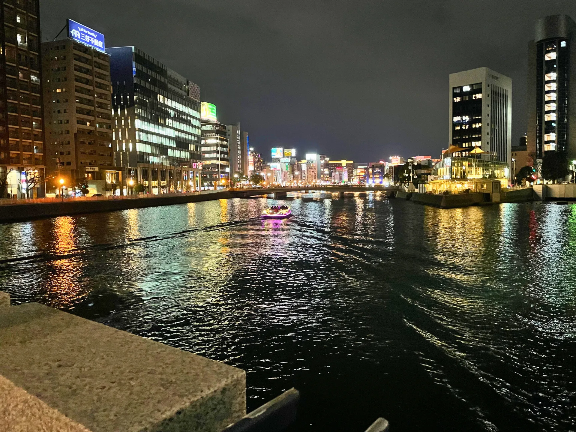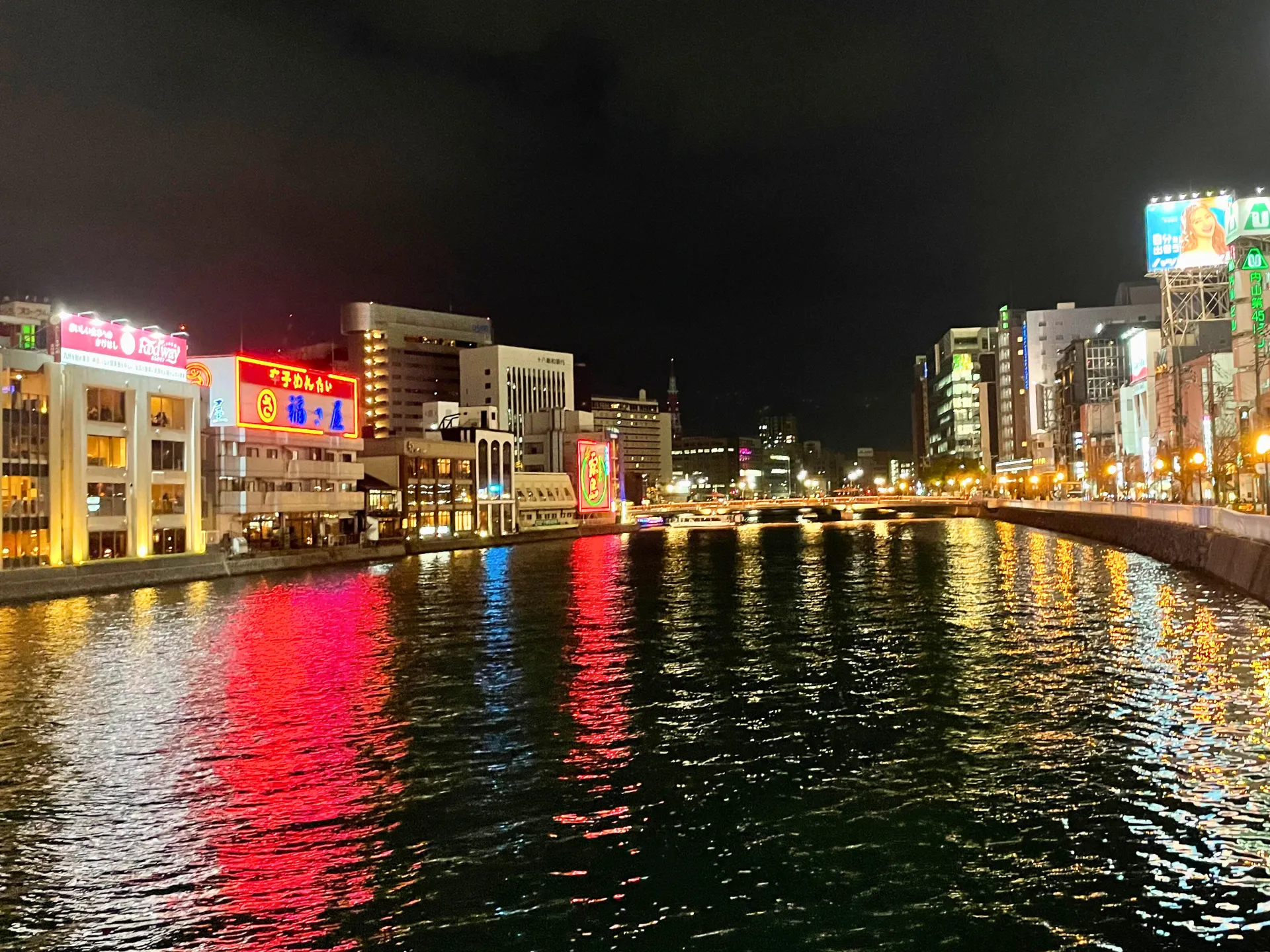 中洲の川沿いでは、ネオンが水面に映り、クルーズ船がゆっくりと進む景色を眺めながらのんびり散策。